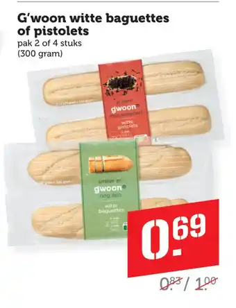 Geniet van de heerlijke G'woon witte baguettes of pistolets, verkrijgbaar in een pak van 2 of 4 stuks (300 gram). Deze knapperige broodjes zijn perfect voor bij het ontbijt of de lunch. Smeer er wat boter of beleg naar keuze op en geniet van de smaakvolle combinatie. Of je nu kiest voor de witte baguettes of pistolets, met G'woon zit je altijd goed. De witte pistolets wegen 300 gram en zijn verpakt per 2 of 4. Bestel nu jouw favoriete broodjes voor slechts 0.69 euro. Jij bent gewoon mijn knappert, dus trakteer jezelf op nog één van deze heerlijke G'woon witte baguettes of pistolets.