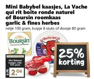 Mini Babybel kaasjes, La Vache qui rit boite ronde naturel of Boursin roomkaas garlic & fines herbes