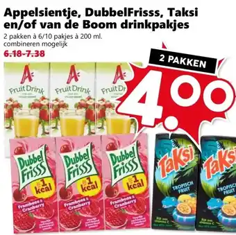 Appelsientje, DubbelFrisss, Taksi en/of van de Boom drinkpakjes korting bij CoopCompact