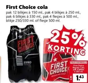 De prijs van de First Choice cola kan ook teruggevonden worden hierboven op de pagina, samen met de datum van wanneer de aanbieding beschikbaar is. Ook kun je de prijzen in de huidige CoopCompact folder of op de CoopCompact website controleren. De aanbiedingen verzekeren je van het kopen van de CoopCompact producten voor de laagste prijs.