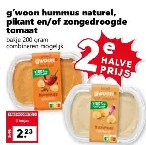 De prijs van de g'woon hummus naturel, pikant en/of zongedroogde tomaat kan ook teruggevonden worden hierboven op de pagina, samen met de datum van wanneer de aanbieding beschikbaar is. Ook kun je de prijzen in de huidige CoopCompact folder of op de CoopCompact website controleren. De aanbiedingen verzekeren je van het kopen van de CoopCompact producten voor de laagste prijs.