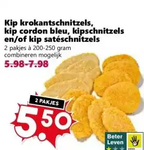 Kip krokantschnitzels, kip cordon bleu, kipschnitzels en/of kip satéschnitzels