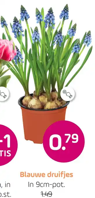 Versier je tuin met prachtige blauwe druifjes in diverse kleuren. Deze bloemen worden geleverd in een 10,5cm-pot en zijn nu verkrijgbaar voor slechts 2,49 per stuk. Profiteer van onze speciale aanbieding: koop 2 blauwe druifjes en ontvang er 1 GRATIS! Deze bloemen zijn perfect voor het opfleuren van je tuin of als cadeau voor een geliefde. Bestel nu en geniet van de prachtige bloemen die deze blauwe druifjes te bieden hebben. Ook verkrijgbaar in een 9cm-pot voor slechts 1,49. Mis deze kans niet om je tuin te transformeren met deze mooie en kleurrijke bloemen!