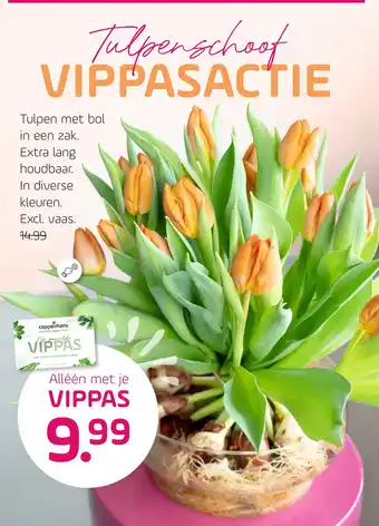 VUL JE HUIS MET DE FRISSE GEUR EN KLEUR VAN TULPEN! Geniet van prachtige tulpen met bol, verpakt in een zak. Deze tulpen zijn extra lang houdbaar en verkrijgbaar in diverse kleuren. De Tulpenschoof VIPPASACTIE is exclusief verkrijgbaar bij Coppelmans, het tuincentrum vol groene ideeën. Spaar unieke extra's en persoonlijk voordeel met de VIPPAS, die alleen verkrijgbaar is voor €9.99. Mis deze kans niet om je huis op te fleuren met deze mooie tulpen en profiteer van de voordelen van de VIPPAS. Haal de lente in huis en geniet van de prachtige bloemen die je interieur zullen verfraaien.
