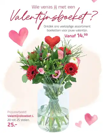 De prijs van de Valentijnsboeket L kan ook teruggevonden worden hierboven op de pagina, samen met de datum van wanneer de aanbieding beschikbaar is. Ook kun je de prijzen in de huidige Coppelmans folder of op de Coppelmans website controleren. De aanbiedingen verzekeren je van het kopen van de Coppelmans producten voor de laagste prijs.