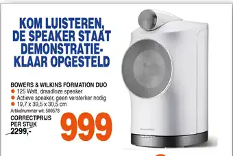 De prijs van de Bowers & wilkins formation duo kan ook teruggevonden worden hierboven op de pagina, samen met de datum van wanneer de aanbieding beschikbaar is. Ook kun je de prijzen in de huidige Correct folder of op de Correct website controleren. De aanbiedingen verzekeren je van het kopen van de Correct producten voor de laagste prijs.