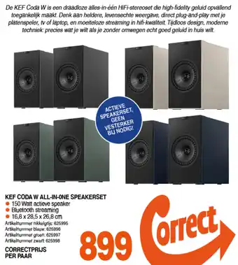 De prijs van de Kef coda w all-in-one speakerset kan ook teruggevonden worden hierboven op de pagina, samen met de datum van wanneer de aanbieding beschikbaar is. Ook kun je de prijzen in de huidige Correct folder of op de Correct website controleren. De aanbiedingen verzekeren je van het kopen van de Correct producten voor de laagste prijs.