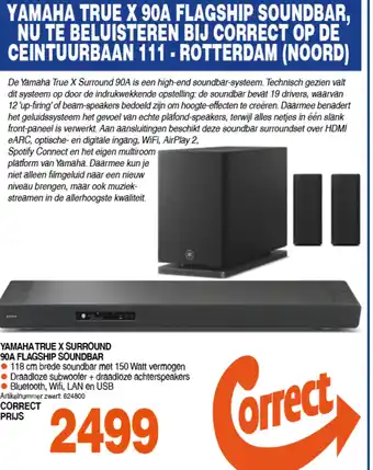 De Yamaha True X Surround 90A is een high-end soundbar-systeem met 19 drivers, waaronder 12 'up-firing' speakers voor hoogte-effecten. Met HDMI eARC, optische- en digitale ingang, WiFi, AirPlay 2 en Spotify Connect. Beleef filmgeluid op een nieuw niveau en stream muziek in topkwaliteit. Nu te beluisteren bij Correct op de Ceintuurbaan 111 in Rotterdam (Noord).