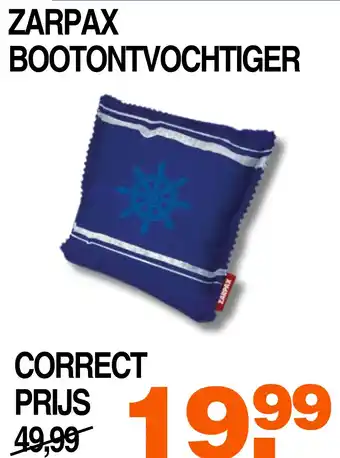 De prijs van de ZARPAX BOOTONTVOCHTIGER kan ook teruggevonden worden hierboven op de pagina, samen met de datum van wanneer de aanbieding beschikbaar is. Ook kun je de prijzen in de huidige Correct folder of op de Correct website controleren. De aanbiedingen verzekeren je van het kopen van de Correct producten voor de laagste prijs.