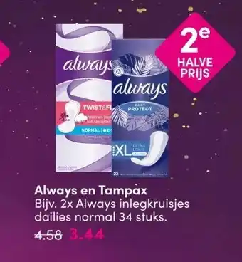 Neem een kijkje voor de goedkoopste producten tussen alle aanbiedingen! Als je wilt weten of DA de hoogste korting voor Always en Tampax heeft, vergelijk het op de Topic page of met andere winkels.