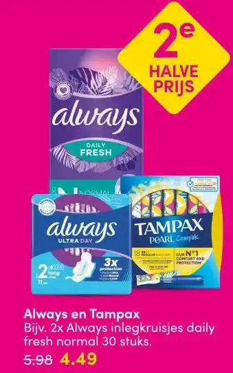 Neem een kijkje voor de goedkoopste producten tussen alle aanbiedingen! Als je wilt weten of DA de hoogste korting voor Always en Tampax heeft, vergelijk het op de Topic page of met andere winkels.