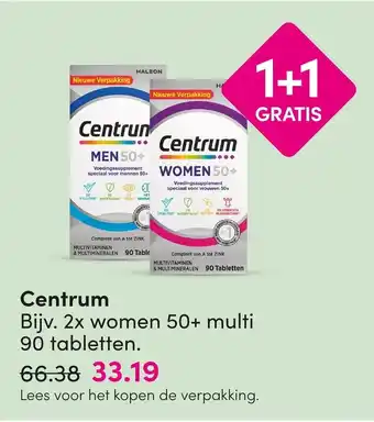 Centrum WOMEN 50+ is een voedingssupplement speciaal ontwikkeld voor vrouwen van 50 jaar en ouder. Het bevat een uitgebalanceerde mix van multivitaminen en multiminerale om vrouwen te ondersteunen in deze levensfase. Met de nieuwe verpakking van 90 tabletten krijg je nu tijdelijk 1+1 GRATIS! Centrum WOMEN 50+ ondersteunt de vitaliteit, weerstand, ogen, geheugen, de hormoonhuishouding, botten en de algehele gezondheid. Met essentiële voedingsstoffen zoals zink en vitaminen A tot Zink, zorgt dit voedingssupplement ervoor dat vrouwen van 50+ alle benodigde vitaminen en mineralen binnenkrijgen. Profiteer nu van deze aanbieding en geef je gezondheid een boost met Centrum WOMEN 50+!