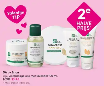 Verwen je geliefde met de heerlijke bodycrème van Da by Erica. Deze bodycrème met amandel voedt en verzacht de droge huid, en maakt de huid soepel en zacht dankzij de toevoeging van vitamine E en lavendelolie. Geschikt voor alle huidtypen. Profiteer nu van de Valentijn TIP: 2x bodycrème voor de prijs van 1! Reinig en verzorg je huid met de reinigingscrème van Da by Erica, die de huid reinigt en make-up verwijdert. Ook verkrijgbaar: scrub & kleimasker, dagcrème en massageolie met lavendel. Alle producten zijn natuurcosmetica en dragen het keurmerk Cosmo Natura. Mis deze kans niet en geef je huid de verzorging die het verdient. *M.u.v. product van de maand.