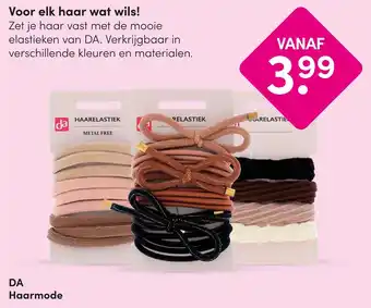 Voor elk haartype wat wils! De haarelastieken van DA zijn verkrijgbaar in verschillende kleuren en materialen. Of je nu op zoek bent naar een metalen vrije elastiek, een badstop elastiek of een elastiek van DA, bij DA Haarmode vind je het allemaal. Met de hoogwaardige kwaliteit van de elastieken zit je haar altijd goed vast. Of je nu een strakke paardenstaart wilt maken of een nonchalante knot, met de elastieken van DA kan het allemaal. Kies jouw favoriete kleur en materiaal en style je haar zoals jij dat wilt. Vanaf nu hoef je nooit meer te worstelen met slechte elastieken die je haar beschadigen. Kies voor kwaliteit, kies voor DA Haarmode.