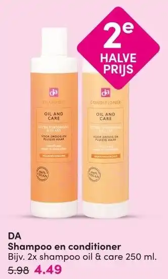 De aanbieding is verkrijgbaar in verschillende winkels, bekijk alle producten om de goedkoopste DA Shampoo en conditioner te krijgen. Als je graag wilt kijken of het artikel met meer korting te koop is in een andere winkel, bekijk de categorie 'Drogist en Parfumerie'. Wellicht vind je deze aanbiedingen ook interessant: Andrélon 2in1 shampoo + conditioner, Andrélon shampoo of conditioner & Gliss shampoo en conditioner.