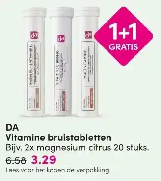 De prijs van de DA Vitamine bruistabletten kan ook teruggevonden worden hierboven op de pagina, samen met de datum van wanneer de aanbieding beschikbaar is. Ook kun je de prijzen in de huidige DA folder of op de DA website controleren. De aanbiedingen verzekeren je van het kopen van de DA producten voor de laagste prijs.