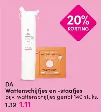 De aanbieding is verkrijgbaar in verschillende winkels, bekijk alle producten om de goedkoopste DA Wattenschijfjes en -staafjes te krijgen. Als je graag wilt kijken of het artikel met meer korting te koop is in een andere winkel, bekijk de categorie 'Drogist en Parfumerie'. Wellicht vind je deze aanbiedingen ook interessant: Da wattenschijfjes en staafjes, Etos wattenschijfjes 140 stuks & Demak'Up wattenschijfjes.