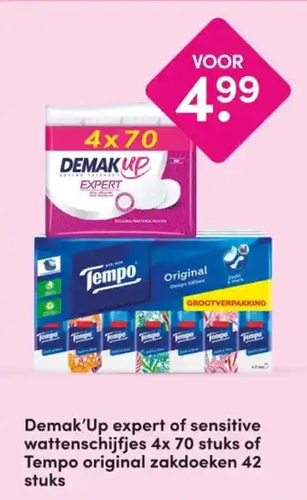 Demak'Up expert of sensitive wattenschijfjes 4x 70 stuks of Tempo original zakdoeken aanbieding bij DA – binnenkort verwacht