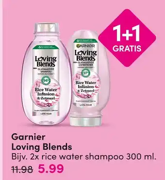 Verwen je haar met de Garnier Loving Blends Gladmakende Shampoo Zonder Siliconen. Deze shampoo, verrijkt met Rice Water Infusion en zetmeel, zorgt voor 72u glans en maakt je haar glad zonder siliconen. Het resultaat is voller haar dat straalt van gezondheid. Profiteer nu van de 1+1 gratis actie en geniet van lang haar dat er prachtig uitziet en zijdezacht aanvoelt. Met Garnier Loving Blends geef je je haar de verzorging die het verdient. Bestel nu bijvoorbeeld 2x de rice water shampoo van 300 ml voor slechts 5.99 in plaats van 11.98. Ontdek zelf de kracht van Garnier en laat je haar stralen!