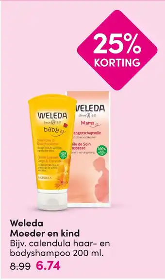 Ontdek de natuurlijke verzorgingsproducten van Weleda voor moeder en kind. Sinds 1921 biedt Weleda hoogwaardige producten aan die mild reinigen en verzorgen van top tot teen. Van de verzachtende Calendula babyshampoo & douchecrème tot de voedende Mama buik- en zwangerschapsolie, Weleda heeft alles wat je nodig hebt voor een natuurlijke verzorging. De Calendula Crème Lavante Corps & Cheveux reinigt mild en verzorgt de huid en het haar van je kleintje. De Calendula Huile de Soin prévient les vergetures en helpt striae te voorkomen. Profiteer nu van 25% korting op geselecteerde Weleda moeder en kind producten en geef jouw gezin de beste verzorging die de natuur te bieden heeft.