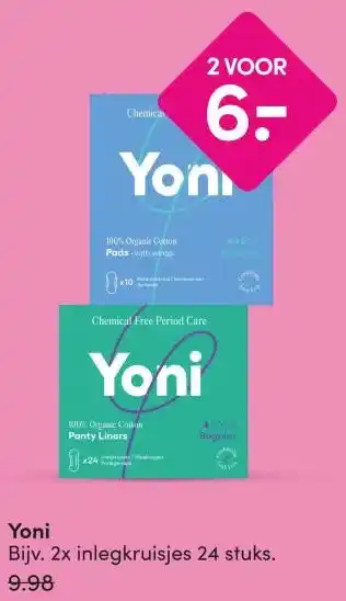DA biedt naast de Yoni een ruime collectie producten aan. Houd de wekelijkse DA folder in de gaten om de beste aanbiedingen en acties te vinden. Naast Yoni, kunt u ook de volgende aanbiedingen vinden: Yoni Inlegkruisjes regular, Yoni Tampons light & Yoni Verband voor urineverlies.