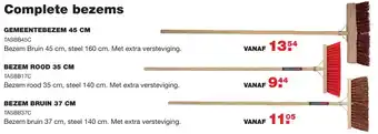 GEMEENTEBEZEM 45 CM TASBB45C Bezem Bruin 45 cm, steel 160 cm. Met extra versteviging. BEZEM ROOD 35 CM TASBB17C Bezem rood 35 cm, steel 140 cm. Met extra versteviging. BEZEM BRUIN 37 CM TASBB37C Bezem bruin 37 cm, steel 140 cm. Met extra versteviging. VANAF 1354 VANAF 944 VANAF 1105