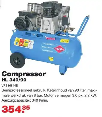 VRB36844E Semiprofessioneel gebruik. Ketelinhoud van 90 liter, maxi- male werkdruk van 8 bar. Motor vermogen 3.0 pk, 2.2 kW. Aanzuigcapaciteit 340 1/min. 354,85