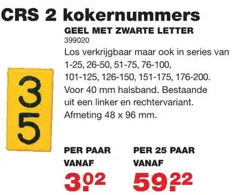 De CRS 2 kokernummers in geel met zwarte letter zijn los verkrijgbaar maar ook in series van 1-25, 26-50, 51-75, 76-100, 101-125, 126-150, 151-175, 176-200. Deze nummers zijn speciaal ontworpen voor een 40 mm halsband en bestaan uit een linker en rechtervariant met een afmeting van 48 x 96 mm. Ze zijn per paar verkrijgbaar en vanaf 25 paar vanaf 302 5922. Met deze opvallende kokernummers zorg je ervoor dat jouw huisdier altijd veilig en herkenbaar is. De geel met zwarte kleurcombinatie zorgt voor een goede zichtbaarheid, zelfs in het donker. Kies voor kwaliteit en stijl met de CRS 2 kokernummers geel met zwarte letter.