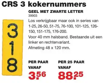 De CRS 3 kokernummers zijn ideaal voor honden met een 40 mm halsband. Deze nummers zijn geel met zwarte letters en hebben het nummer 39903. Ze bestaan uit een linker- en rechtervariant met een afmeting van 48 x 120 mm. Je kunt deze nummers per paar aanschaffen, vanaf 3 paar. Voor grotere hoeveelheden kun je kiezen voor een pakket van 25 paar, vanaf 8 pakketten. Met deze nummers kun je jouw hond eenvoudig identificeren en ervoor zorgen dat hij altijd veilig is. De nummers zijn duurzaam en van hoge kwaliteit, zodat ze lang meegaan. Bestel vandaag nog jouw CRS 3 kokernummers en zorg voor de veiligheid van jouw trouwe viervoeter!