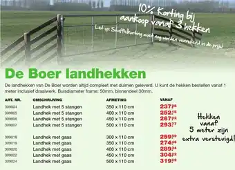 De De Boer landhekken is momenteel met korting verkrijgbaar bij De Boer Drachten. Hier vind je alle details over prijs, geldigheidsduur en actievoorwaarden. Vergeet niet om ook andere aanbiedingen en deals voor De Boer landhekken te bekijken zodat je zeker weet dat je de beste prijs betaalt. De kortingsactie loopt van 21-04-2026 tot 31-12-2026. Is de actie inmiddels verlopen? Geen zorgen, vergelijk dan soortgelijke aanbiedingen of volg de productcategorie voor toekomstige prijsverlagingen. Zo koop je altijd met voordeel.Veelgestelde vragen over De Boer landhekken