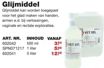 Agrivet Vet Gel is een hoogwaardig glijmiddel dat kan worden toegepast voor het glad maken van handen, armen etc. bij verlossingen, vaginale en rectale exploraties. Dit glijmiddel heeft een inhoud van 500 ml en is verkrijgbaar voor een scherpe prijs van slechts €3,90. Het is ook verkrijgbaar in grotere hoeveelheden zoals 1 liter (€5,95) en zelfs 5 liter (€124,2). Met het ART. NR. 602042 ben je verzekerd van een kwalitatief product dat voldoet aan al jouw behoeften. Bestel nu en maak het werk gemakkelijker en comfortabeler met Agrivet Vet Gel glijmiddel.