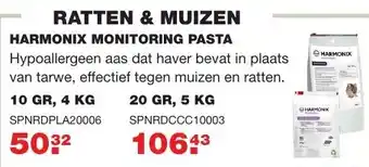 SPNRDCCC10003 RATTEN & MUIZEN HARMONIX MONITORING PASTA Hypoallergeen aas dat haver bevat in plaats van tarwe, effectief tegen muizen en ratten. 10 GR, 4 KG 20 GR, 5 KG SPNRDPLA20006 5032 10643 HARMONIX