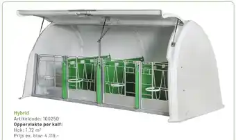 De Hybrid kalfshokken zijn ideaal voor veehouders die op zoek zijn naar een efficiënte oplossing voor het huisvesten van kalveren. Met een oppervlakte van 1,72 m² per kalf bieden deze hokken voldoende ruimte voor comfort en groei. De artikelcode voor deze kalfshokken is 100250 en de prijs exclusief btw bedraagt 4.119,-. Dankzij het hybride ontwerp kunnen veehouders profiteren van de voordelen van zowel traditionele als moderne huisvestingssystemen. De Hybrid kalfshokken zijn duurzaam, gemakkelijk schoon te maken en bevorderen een gezonde leefomgeving voor de kalveren. Kies voor de Hybrid kalfshokken en optimaliseer de ruimte in uw stal voor een succesvolle veehouderij.