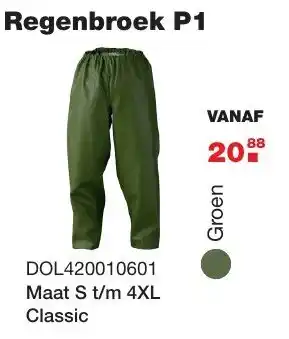De Regenbroek P1 is momenteel met korting verkrijgbaar bij De Boer Drachten. Hier vind je alle details over prijs, geldigheidsduur en actievoorwaarden. Vergeet niet om ook andere aanbiedingen en deals voor Regenbroek P1 te bekijken zodat je zeker weet dat je de beste prijs betaalt. De kortingsactie loopt van 21-04-2026 tot 31-12-2026. Is de actie inmiddels verlopen? Geen zorgen, vergelijk dan soortgelijke aanbiedingen of volg de productcategorie voor toekomstige prijsverlagingen. Zo koop je altijd met voordeel.Veelgestelde vragen over Regenbroek P1