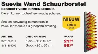 De Suevia Wand Schuurborstel is een nieuw product van deBoer -2026- en is geschikt voor binnengebruik. Deze schuurborstel is snel en eenvoudig te monteren in zowel individuele als groepshuisvesting. Dieren kunnen zichzelf eenvoudig schuren aan deze borstel, die verkrijgbaar is in twee maten: klein (50 x 15 cm) en groot (90 x 30 cm). Met het artikelnummer 2154 is deze schuurborstel een handige toevoeging aan elke stal of dierenverblijf. Geef jouw dieren de mogelijkheid om zichzelf te verzorgen en te ontspannen met de Suevia Wand Schuurborstel. Bestel hem vandaag nog en zie hoe blij jouw dieren zullen zijn met deze praktische en effectieve borstel.