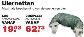 Bescherm de spenen en uier van uw koeien met de AKR3999822XL en AKR399983S uiernetten. Deze uiernetten bieden maximale bescherming tegen schuren en beschadigingen, waardoor uw vee gezond en comfortabel blijft. De uiernetten zijn verkrijgbaar in verschillende maten, vanaf 1903 6273, zodat u altijd de juiste maat kunt kiezen voor uw kudde. De uiernetten zijn compleet en eenvoudig te bevestigen, waardoor u ze snel en efficiënt kunt gebruiken. Met de LOS uiernetten van hoge kwaliteit kunt u er zeker van zijn dat uw koeien de beste zorg krijgen die ze verdienen. Kies voor maximale bescherming en kwaliteit met de AKR3999822XL en AKR399983S uiernetten.