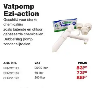 De Vatpomp Ezi-action is geschikt voor sterke chemicaliën, zoals bijtende en chloor gebaseerde chemicaliën. Deze dubbelslag pomp zonder slijtdelen is verkrijgbaar in verschillende formaten, waaronder 25/30 liter, 60 liter en 200 liter. De prijzen variëren van 5332 tot 8867, afhankelijk van het formaat. Met de ART. NR. SPN220127 SPN220169 en SPN220108 kunt u eenvoudig en veilig chemicaliën uit vaten pompen. Daarnaast bieden wij ook reinigingspakketten aan om uw Vatpomp Ezi-action in topconditie te houden. Kies voor kwaliteit en betrouwbaarheid met de Vatpomp Ezi-action voor al uw chemische behoeften.