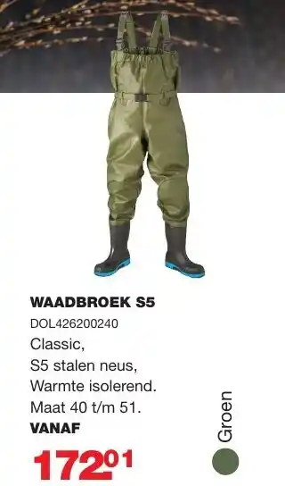 De aanbieding is verkrijgbaar in verschillende winkels, bekijk alle producten om de goedkoopste Waadbroek s5 te krijgen. Als je graag wilt kijken of het artikel met meer korting te koop is in een andere winkel, bekijk de categorie 'Bouwmarkt'. Wellicht vind je deze aanbiedingen ook interessant: Waadbroek, S. Oliver & Prophyl S.