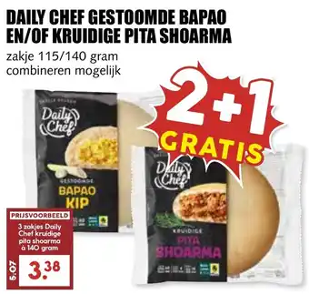 Geniet van de heerlijke smaak van Daily Chef Gestoomde Bapao en/of Kruidige Pita Shoarma. Kies uit een zakje van 115/140 gram en combineer naar wens. Profiteer van de 2+1 actie waarbij je het derde zakje gratis krijgt. Voor een prijsvoorbeeld van slechts 5.07 euro kun je 3 zakjes Daily Chef kruidige pita shoarma van 140 gram aanschaffen. Probeer ook de gestoomde bapao kip voor slechts 3.38 euro per zakje. Met Daily Chef geniet je van kwalitatief hoogwaardige producten voor een voordelige prijs. Haal de smaken van de wereld in huis met de kruidige pita shoarma en gestoomde bapao van Daily Chef.