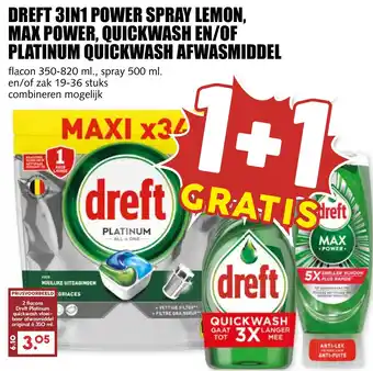 Dreft 3in1 power spray lemon, max power, quickwash en/of platinum quickwash afwasmiddel 1+1 GRATIS