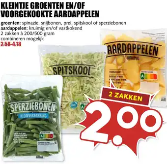 Kies uit spinazie, snijbonen, prei, spitskool of sperziebonen en kruimige en/of vastkokende aardappelen. De groenten zijn verkrijgbaar in zakken van 200/500 gram, waarbij combineren mogelijk is. De prijs varieert van 2.58 tot 4.18 euro. De voorgekookte aardappelen zijn kruimig en spitskool, klaar om te bakken in 10 minuten in de pan of 5 minuten in de magnetron. De sperziebonen zijn verpakt in kleine porties van 2.00 euro per zak. Alle producten zijn voorzien van een Nutri-Score van 2 en worden geleverd in 2 zakken. Geniet van een gezonde en gemakkelijke maaltijd met deze kleintjes groenten en/of voorgekookte aardappelen.