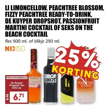 De aanbieding is verkrijgbaar in verschillende winkels, bekijk alle producten om de goedkoopste Li limoncellow, fizzy peachtree, de kuyper dropshot, passionfruit martini cocktail of seks on the beach cocktail te krijgen. Als je graag wilt kijken of het artikel met meer korting te koop is in een andere winkel, bekijk de categorie 'Supermarkt'. Wellicht vind je deze aanbiedingen ook interessant: Peachtree Peach on the Beach, Peachtree Fizzy & De Kuyper Dropshot.