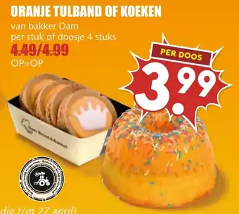 Geniet van heerlijke Oranje Tulband of Koeken van Bakker Dam, verkrijgbaar per stuk of in een doosje van 4 stuks. Deze smakelijke lekkernijen zijn nu extra voordelig geprijsd, slechts 4.49/4.99 per doosje. Profiteer snel, want OP=OP! Als u een doosje koopt, betaalt u slechts 3.99 per doos. Deze aanbieding is geldig t/m 27 april. Trakteer uzelf op deze feestelijke lekkernijen en geniet van de heerlijke smaak van Oranje Tulband of Koeken. Perfect voor bij de koffie of thee, of gewoon als tussendoortje. Haal ze nu in huis en verras uw smaakpapillen met deze heerlijke traktatie van Bakker Dam.
