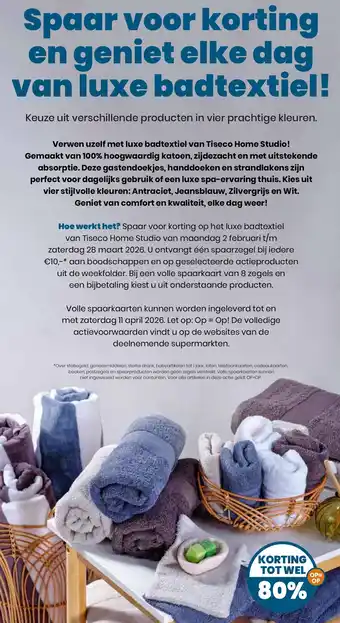 Verwen uzelf met luxe badtextiel van Tiseco Home Studio! Gemaakt van 100% hoogwaardig katoen, zijdezacht en met uitstekende absorptie. Deze gastendoekjes, handdoeken en strandlakens zijn perfect voor dagelijks gebruik of een luxe spa-ervaring thuis. Kies uit vier stijlvolle kleuren: Antraciet, Jeansblauw, Zilvergrijs en Wit. Hoe werkt het? Spaar voor korting op het luxe badtextiel van Tiseco Home Studio van maandag 2 februari t/m zaterdag 28 maart 2026. U ontvangt één spaarzegel bij iedere €10,- aan boodschappen en op geselecteerde actieproducten uit de weekfolder. Bij een volle spaarkaart van 8 zegels en een bijbetaling kiest u uit onderstaande producten. Volle spaarkaarten kunnen worden ingeleverd tot en met zaterdag 11 april 2026. KORTING TOT WEL 80%, OP= OP.