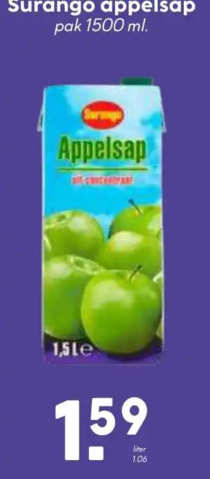 Geniet van de verfrissende smaak van Surango appelsap in een handig pak van 1,5 liter. Deze heerlijke appelsap van Surango is gemaakt van de beste appels en bevat geen toegevoegde suikers of conserveermiddelen. Met 1,5 liter appelsap kun je eindeloos genieten van de pure smaak van appels. Of je nu een glas bij het ontbijt drinkt, meeneemt naar je werk of serveert bij een feestje, Surango appelsap is altijd een goede keuze. De handige verpakking zorgt ervoor dat je het appelsap gemakkelijk kunt bewaren en schenken. Probeer Surango appelsap en ontdek zelf waarom dit zo'n geliefde dorstlesser is. Bestel nu en geniet van de natuurlijke en verfrissende smaak van Surango appelsap!