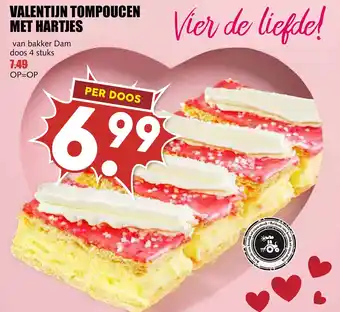 Vier de liefde met de heerlijke Valentijn Tompoucen Met Hartjes van bakker Dam! Deze eerlijk uit eigen streek bereide lekkernijen zitten verpakt in een doos van 4 stuks. Geniet van het beste en meest verse gebak voor slechts 6.99 per doos. Wees er snel bij, want OP=OP! Laat je geliefde weten hoeveel je van hem of haar houdt met deze heerlijke traktatie. De hartvormige decoraties maken deze tijdelijke lekkernij extra speciaal. Bestel nu en verras jouw Valentijn met deze smaakvolle traktatie. Perfect voor een romantisch ontbijt op Valentijnsdag of gewoon als lief gebaar op elk moment van het jaar. Proef de liefde in elke hap!