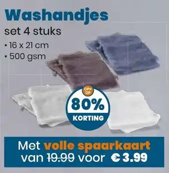 Met deze set van 4 stuks washandjes van 500 gsm kun je jouw badkamer een luxe uitstraling geven. De washandjes zijn gemaakt van hoogwaardig materiaal en voelen zacht aan op de huid. Dankzij de 80% korting betaal je slechts €3.99 in plaats van €19.99 met een volle spaarkaart. De washandjes zijn ideaal voor dagelijks gebruik en kunnen gewassen worden op hoge temperaturen. Ze zijn verkrijgbaar in verschillende kleuren, zodat je ze kunt matchen met de rest van je badkameraccessoires. Profiteer nu van deze aanbieding en haal deze kwalitatieve washandjes in huis voor een zeer voordelige prijs!