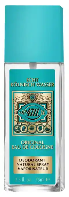 De Online Drogist biedt naast de 4711 Original Eau de Cologne Deodorant een ruime collectie producten aan. Houd de wekelijkse De Online Drogist folder in de gaten om de beste aanbiedingen en acties te vinden. Naast 4711 Original Eau de Cologne Deodorant, kunt u ook de volgende aanbiedingen vinden: 4711 Original Eau de Cologne Deodorant Natural Spray 75ML, 4711 Original Eau de Cologne 150ML & 4711 Original Eau de Cologne Spray 100ML.