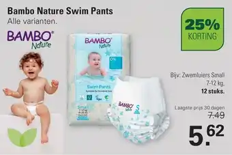 De BAMBO Nature Swim Pants zijn geschikt voor de gevoelige huid en zijn verkrijgbaar in alle varianten. Deze zwemluiers zijn speciaal ontworpen voor jongens en meisjes van 7-12 kg. Met 25% korting op de laagste prijs van 7.49, betaal je slechts 5.62 voor een verpakking van 12 stuks. BAMBO Nature staat bekend om zijn 0% schadelijke stoffen en is daarom perfect voor de gevoelige huid van je kleintje. Met deze Swim Pants kan je kind zorgeloos genieten van het water. Profiteer nu van de aanbieding en bestel de BAMBO Nature Swim Pants Small met 25% korting. Gegarandeerd de beste prijs voor hoogwaardige zwemluiers!