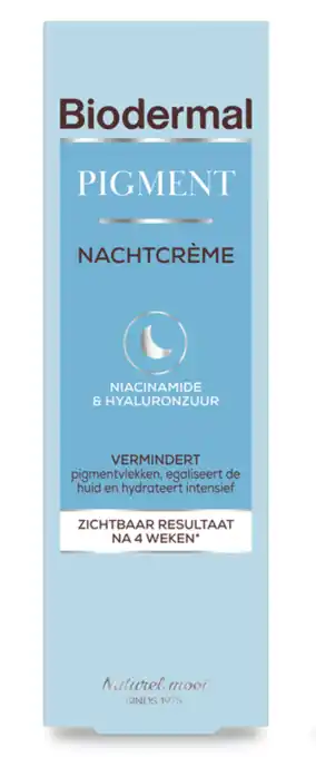 Nu in de aanbieding bij De Online Drogist: Biodermal Pigment Nachtcrème met Niacinamide & Hyaluronzuur 50ML✅ Actie geldig van 22-04 t/m 22-04.